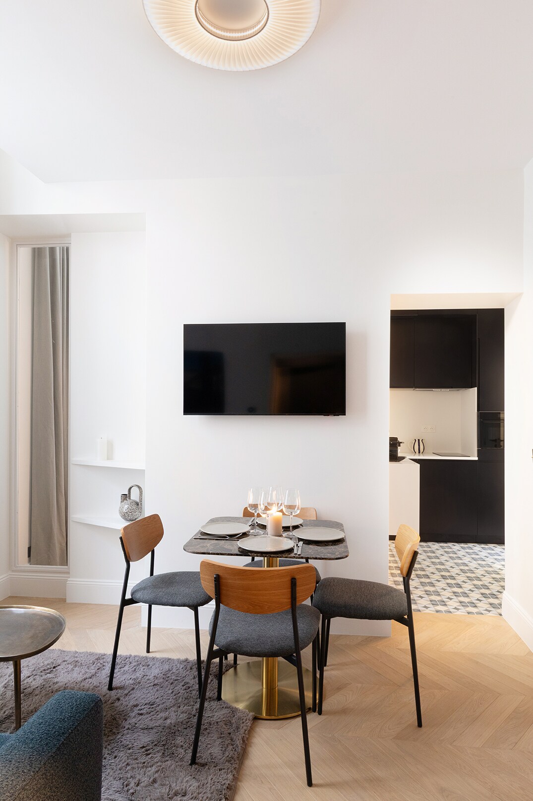 Nestled by Place de la Bourse, this fully renovated 30-square-meter apartment blends classic elegance with modern comfort. Featuring wood floors and abundant natural light, it offers a stylish separate living room, a cozy sleeping area with a ceiling fan above the bed, and a fully equipped kitchen. The brand new bathroom adds a touch of luxury. Steps from cafés, boutiques, and landmarks, this charming apartment is the perfect Parisian escape.