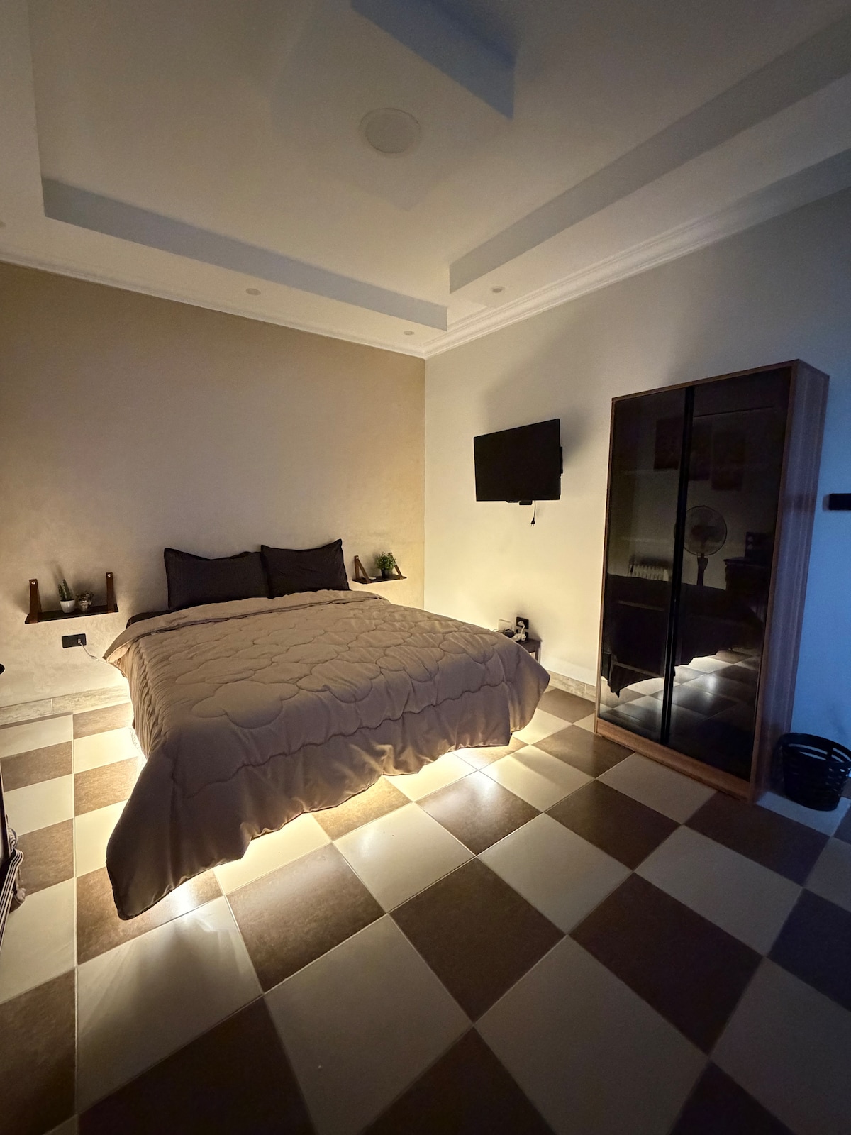Վայելեք նորաձև փորձառություն։ Բարի գալուստ 6-րդ Հոկտեմբերի քաղաքի սրտում գտնվող ընդարձակ հանգստավայր, որը նախատեսված է միայն ընտանիքի համար։ Այս ժամանակակից 3 սենյականոց, 2 լոգասենյակով բնակարանը նախատեսված է հարմարավետության, հանգստի և հարմարավետության համար՝ կատարյալ ընտանիքների և գործարար ճանապարհորդների համար, ովքեր ցանկանում են հանգիստ, մաքուր և լիովին կահավորված մնալ։ Տարածքը 1 ննջասենյակ երկտեղանի մահճակալով 2 ննջասենյակ, յուրաքանչյուրում՝ երկու 120 սմ մահճակալ 2 զուգարան ՝ ցնցուղներով Լուսավոր հյուրասենյակ՝ 55 դյույմ անկյունագծով սմարթ հեռուստացույցով Լիովին օդորակված ՝ ամբողջ տարվա հարմարավետության համար