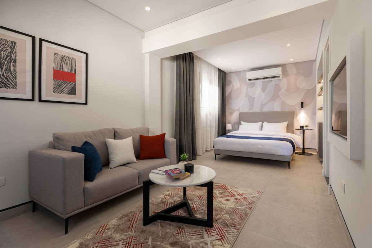 Welcome to our modern 3BR (170 sqm) hotel apartment by West Somid Developments! Designed for families, groups & professionals. Enjoy 5G Wi-Fi, 4 smart TVs, electric shutters & new furniture. 24/7 security, guest lobby, food delivery & optional cleaning. Free weekly cleaning. Guests can also enjoy a shared rooftop lounge — great for movie nights, relaxing evenings & family time. Just minutes from Mall of Arabia & top Zayed spots! ما نقدر نستضيف أي ثنائي عربي غير متزوج في نفس الشقة.