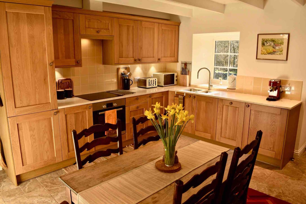 Warm, comfortable house in private woodland location. 2 acres of garden to enjoy. Sitting room, dining room ,3 bedrooms , 2 bathrooms, cloakroom with WC. There is NO KITCHEN. Large off road parking area with wide double gate access, car essential to enjoy this stunning area. NEW for 2025 Outdoor summerhouse Kitchen/Dining/ Music /Aga Heated space for larger groups and longer stays who wish to self cater. This is an optional extra £20 per night if required bookable and payable to host on arrival