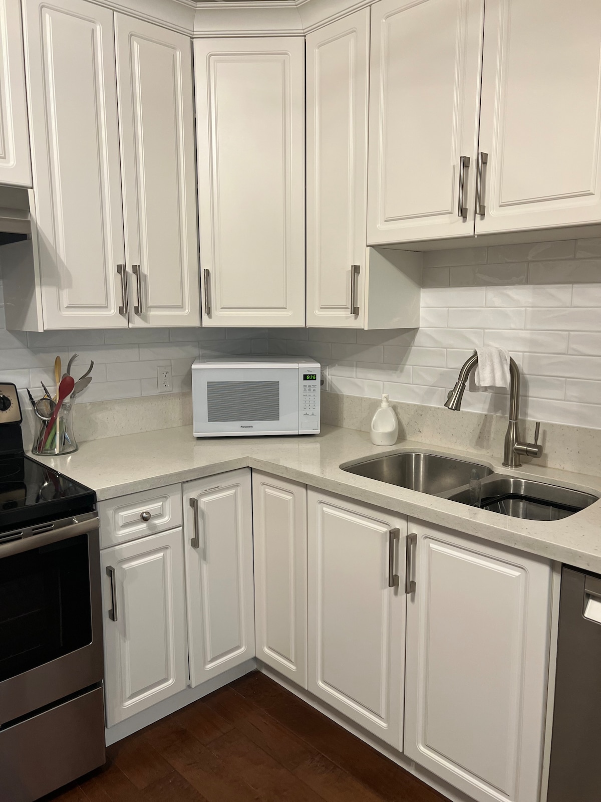 Առանձին հարկաբաժին, որը կցված է մեր տանը ։ Մեկ ննջասենյակն է ՝ մեծ պահարանով և երկտեղանի մահճակալով, 3/4 լոգասենյակով և հյուրասենյակով ։ Ամբողջական խոհանոցը ներառում է լվացարան, սառնարան, միկրոալիքային վառարան, սրճեփ և սպասք և այլն: Քաշեք բազմոցին քնելու համար (թագուհի): Դուք կունենաք սեփական մուտք ՝ առանձին պատիոով և կայանատեղով ։