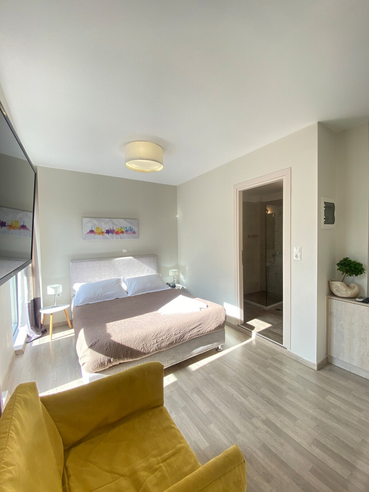 Պարզ, ժամանակակից դիզայնով և մեղմ չեզոք երանգներով լուսավոր, հարմարավետ սենյակ, որը հարմարավետ հանգիստ է առաջարկում Աթենքի սրտում։ Վայելեք հարմարավետ երկտեղանի մահճակալը, փայտե հատակը, ցնցուղով ժամանակակից լոգասենյակը, օդորակիչը, անվճար Wi-Fi-ը և սառնարանը՝ ձեր հիմնական պարագաների համար։ Մեծ պատուհաններից բացվում է քաղաքի տեսարան, և սենյակը լցվում է բնական լույսով։ Ձեր օրը սկսեք նախասրահում անվճար սուրճով և ավարտեք տանիքում՝ համայնապատկերային տեսարաններով և հանգստացնող ջակուզիով։