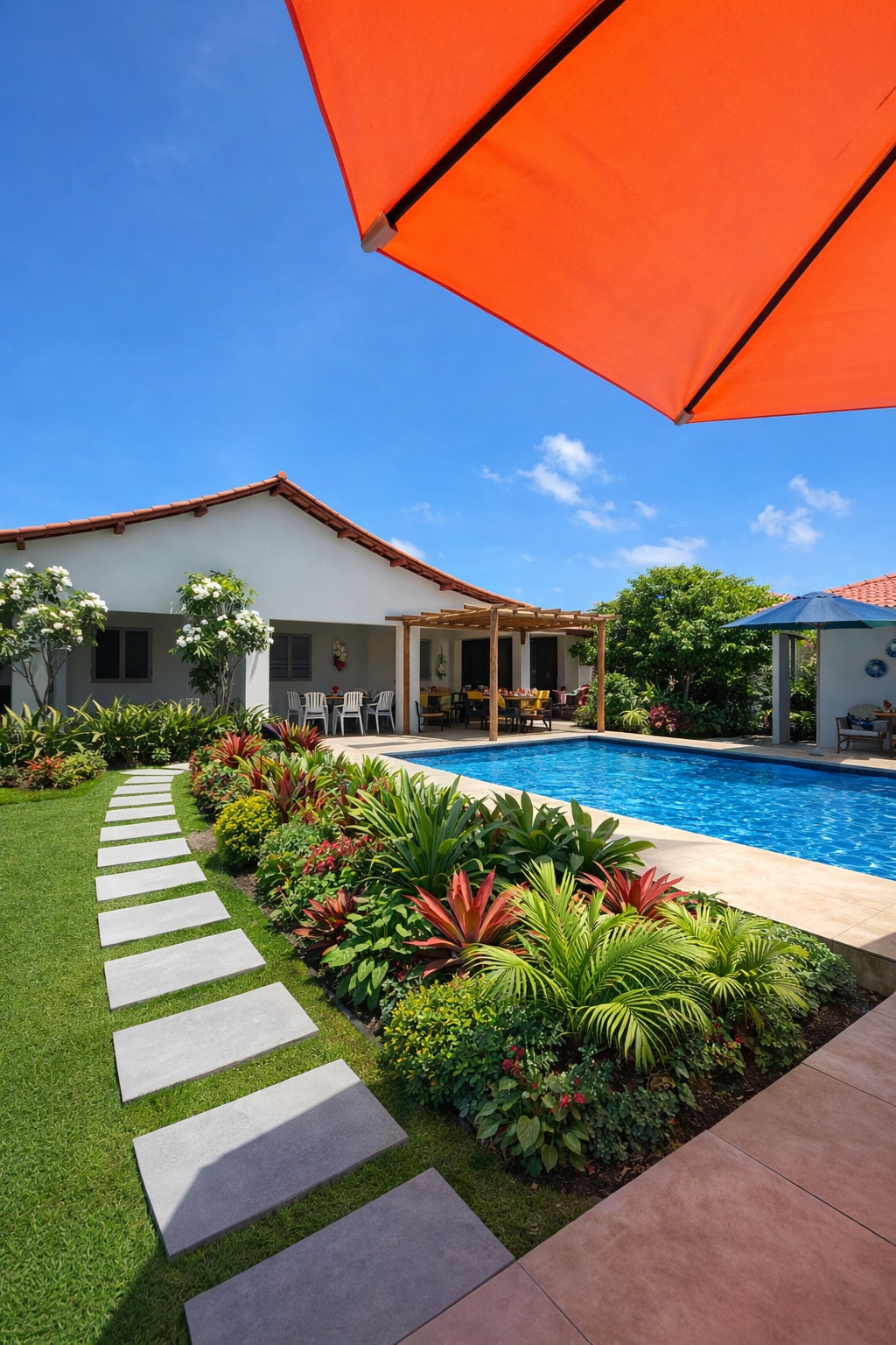 Լողափնյա տուն ՝ լողավազանով և լողափնյա թենիսի կորտով ։