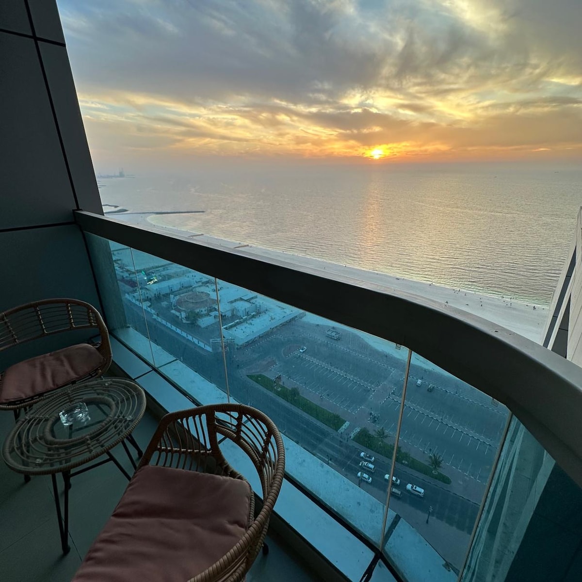 Brand-new luxury studio in Ajman One Towers with stunning sea view and just a short walk to the beach. The studio is surrounded by restaurants, cafés and all the daily essentials. Fully equipped for short or long stays. - Fast Wifi - Air Conditioner - Fitted Full Kitchen - Full Bathroom - King Size Bed - Smart 60 Inch TV - Sofa - Working Desk - Dinning Table - Dresser - Wardrobe - Luggage Bench