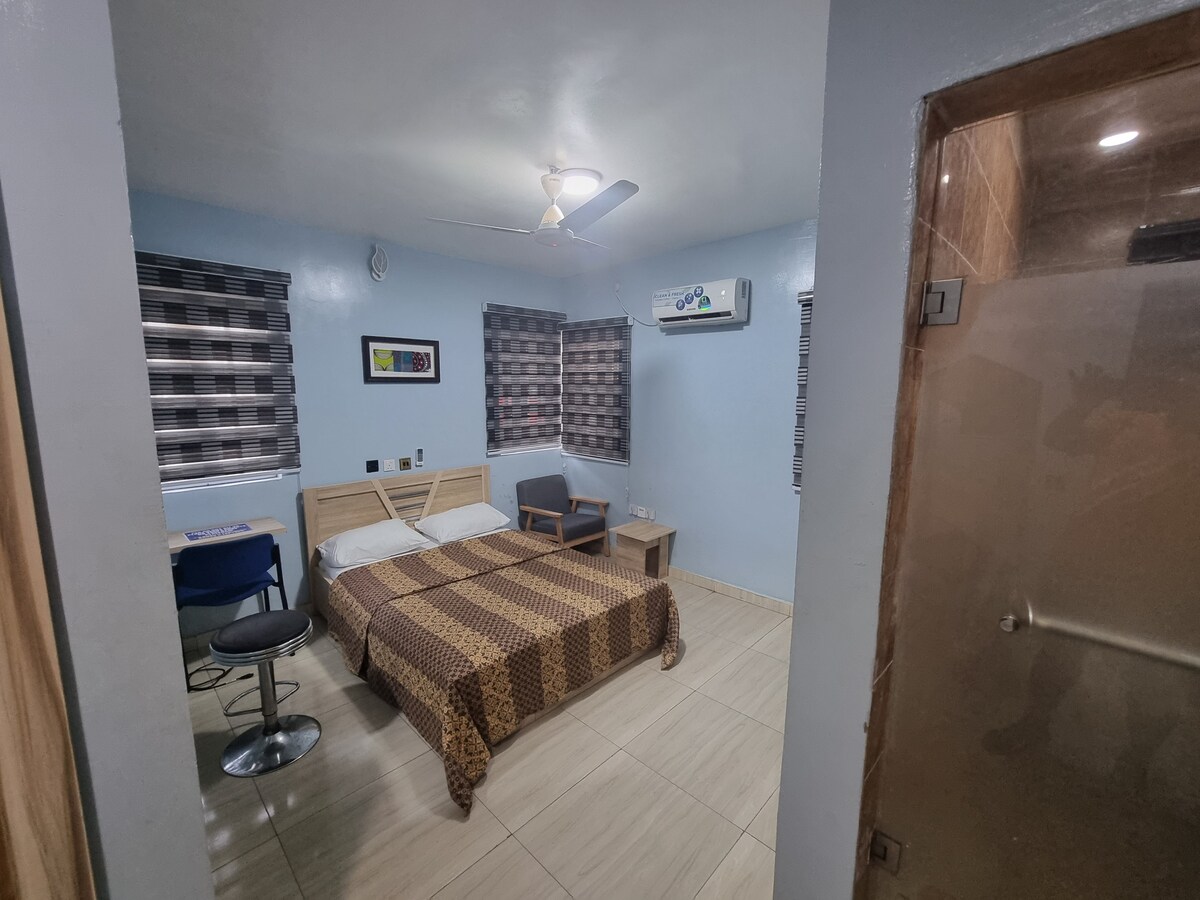 Beautiful & well ventilated self-contain premium serviced apartments are available for short let in a serene and secure environment just 5 minutes drive to the University of Ibadan. Facilities include; 24 Hour Solar Inverter Power Supply, Wardrobe, Air Conditioning, en-suite bathroom furnished kitchen with Microwave Oven, Inverter Refrigerator, Treated Water supply, Free laundry CCTV Permanent 24-hour security guard, Electric fencing system & Spacious car park Wifi is under maintenance