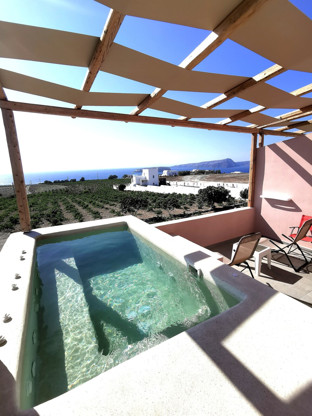 Կախված Օիայի ժայռերից ՝ Amazing View Villa - ն առաջարկում է անխափան տեսարաններ դեպի Կալդերա և Հրաբուխ կղզիներ ։ Ժայռերի անմիջապես եզրին կա ջակուզի, որտեղ կարող եք ներծծվել և վայելել անծայրածիր կապույտ տեսարանը ։ Կատարյալ է մեղրամիսների և սիրահար զույգերի համար, Վիլլան բաղկացած է 2 մակարդակից: Դուք կգտնեք ննջասենյակ ՝ երկտեղանի մահճակալով և լոգասենյակով, որը գտնվում է ավելի բարձր մակարդակի վրա ։ Ստորին մակարդակն ունի լաունջ տարածք և մուտք դեպի բակ ՝ ջակուզիով և հիասքանչ տեսարաններով ։