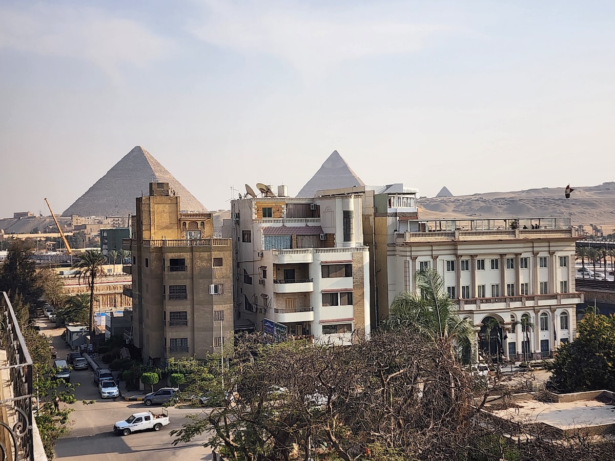 Բարի գալուստ մեր հմայիչ 1 ննջասենյակ Գիզայում, որտեղից կարող եք վայելել Մեծ բուրգերի տպավորիչ տեսարանները հենց ձեր առանձին պատշգամբից: Հարմարավետ մահճակալով և կից լոգասենյակով այս տարածքը կատարյալ է ուսումնասիրման օրվանից հետո հանգստանալու համար ։ Մեր բնակարանը գտնվում է Քեոփսի բուրգերից և Եգիպտոսի Մեծ թանգարանից ընդամենը 5 րոպե հեռավորության վրա ՝ ոտքով հեռու է նաև սքանչելի ռեստորաններից, սրճարաններից և սուպերմարկետներից ։ Վայելեք անվճար նախաճաշ մեր տանիքի սրճարանում: