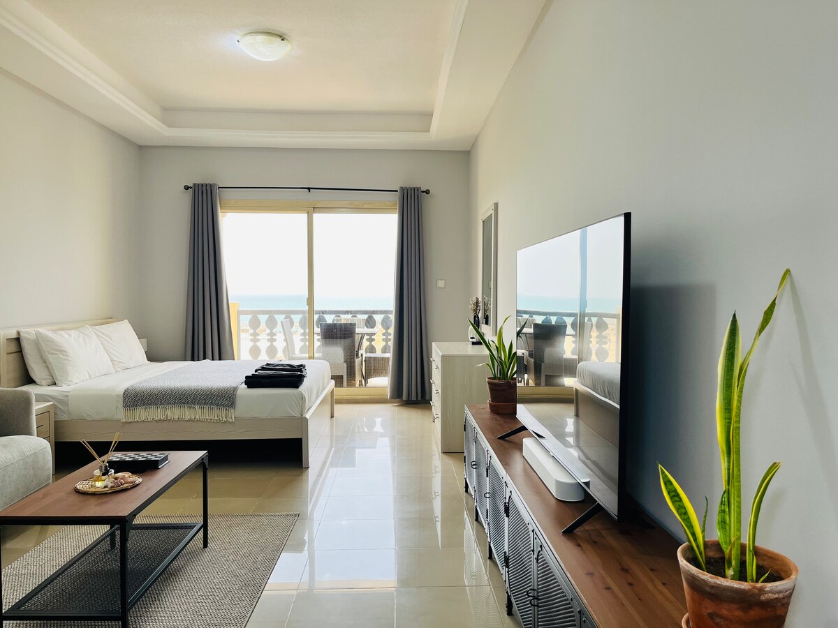Հարմարավետություն զգացեք այս լիովին կահավորված ստուդիայում ՝ Marina Apartments - ում, Ալ Համրա Վիլիջում ։ Վայելեք ամբողջական խոհանոց ՝ Nespresso մեքենայով, խելացի Siri - ի կողմից վերահսկվող լուսավորությամբ և ձայնով, և ազատ կշիռներով ՝ արագ մարզվելու համար ։ Հանգստացեք սենսորով լուսավորված լոգասենյակով, հարմարավետ բազմոցով, Sonos ձայնային բարով հեռուստացույցով և ծովի ցնցող տեսարաններով ։ Ընդամենը 3 րոպե մինչև լողափ, 1 րոպե մինչև լողավազան և խաղահրապարակ և 2 րոպե մինչև մթերային խանութ ։ Կատարյալ հանգիստ հանգստի և մայրամուտների համար ։