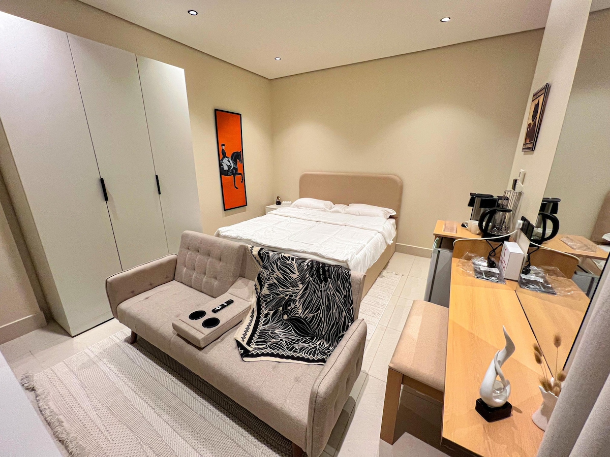 ✨ استديو أنيق ومريح صُمم بعناية ليمنحك إقامة هادئة وممتعة. يتميز بتصميم عصري وأثاث مريح، مع إضاءة جميلة تعطي إحساسًا بالدفء والراحة منذ لحظة الدخول. 🛏️ يحتوي الاستديو على سرير مريح، 🛋️ منطقة جلوس أنيقة، و📺 تلفزيون ذكي، بالإضافة إلى 🌿 بلكونة خاصة مثالية للاستمتاع بالقهوة ☕ أو الأجواء الهادئة بعد يوم طويل. 🚿 الحمام نظيف وحديث مع مستلزمات ضرورية للنزلاء. 👤👫 الاستديو مناسب للأفراد أو الأزواج، ويوفر خصوصية وراحة تامة، مع اهتمام عالٍ بالنظافة ✨ والتفاصيل لضمان تجربة إقامة مم