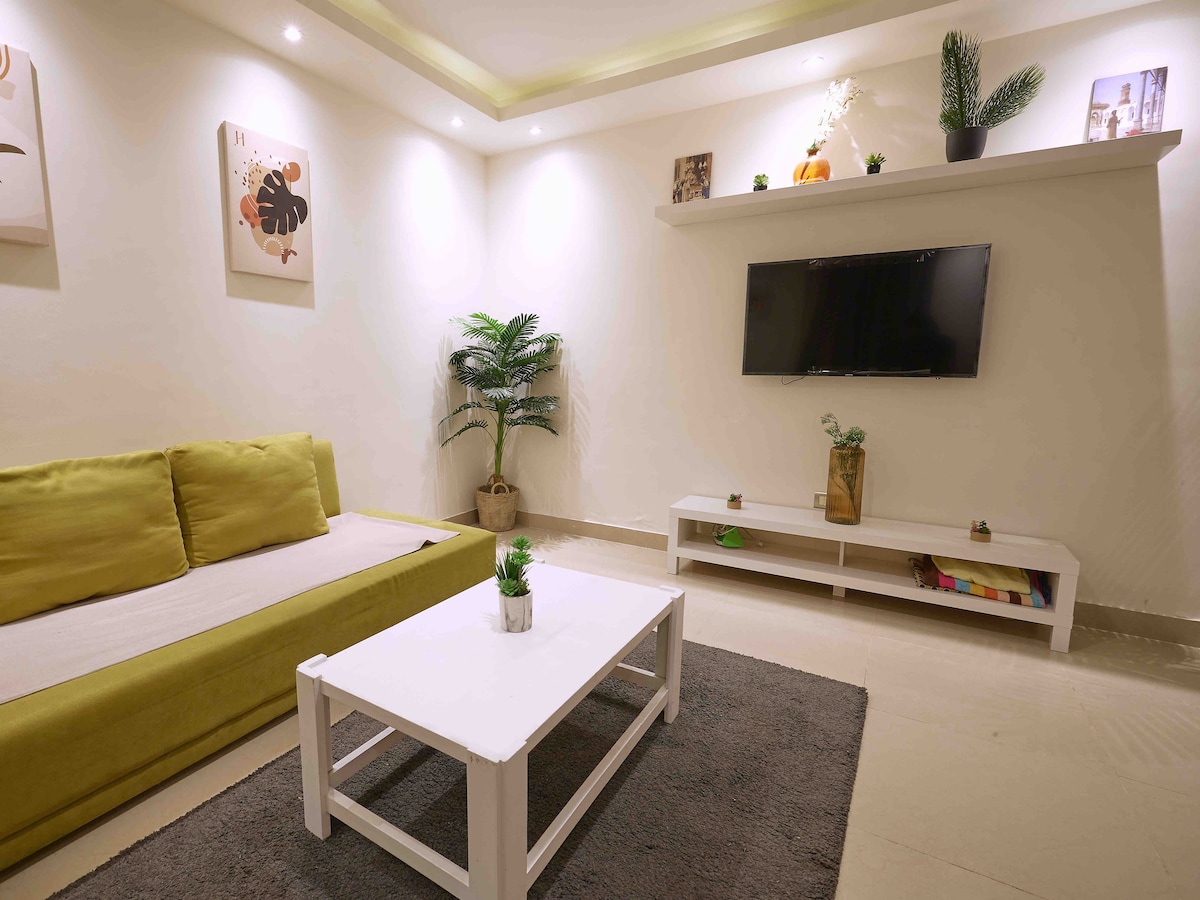 Relax in a stylish, jungle-inspired 1BDR apartment in vibrant Heliopolis. Perfect for couples or remote workers, it offers a comfy queen bed, modern living space, fully equipped kitchen, workspace, high-speed WiFi, and 10 min to the airport. Enjoy authentic Egyptian vibes in a quiet area with easy city access. Ideal for couples, solo travelers & remote workers. Please note: Arab/Egyptian couples must present proof of marriage. Smoking is allowed only outside.