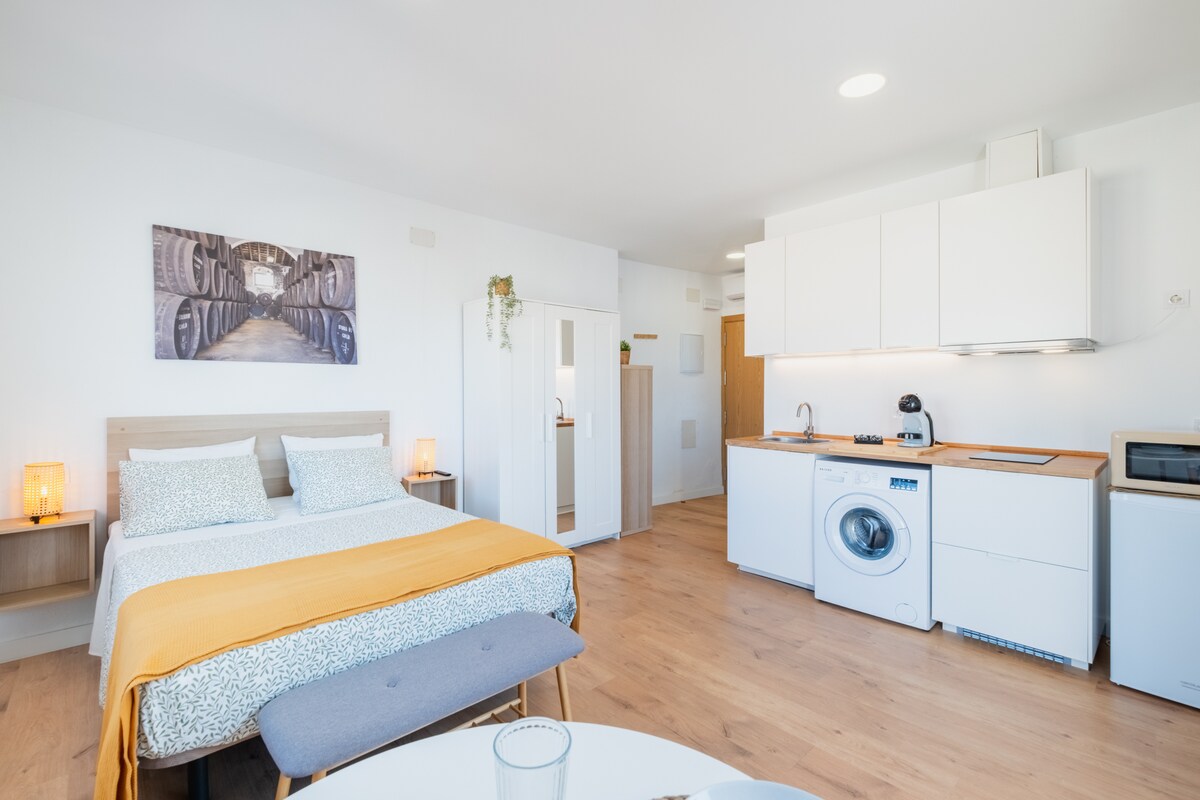 Disfruta de una experiencia única en este alojamiento en el centro de Jerez. Se trata de un estudio situado en la segunda planta de una casa antigua sin ascensor. Tiene ventanas al exterior, desde las que se ve la Catedral de Jerez, con paredes de piedra recuperadas de la construcción original del siglo XVIII y con una cuidada decoración. Dispone de un gran espacio en el que encontramos la cama, un lugar de estudio y una mesa de comedor, además, dispone de cocina completamente equipada.