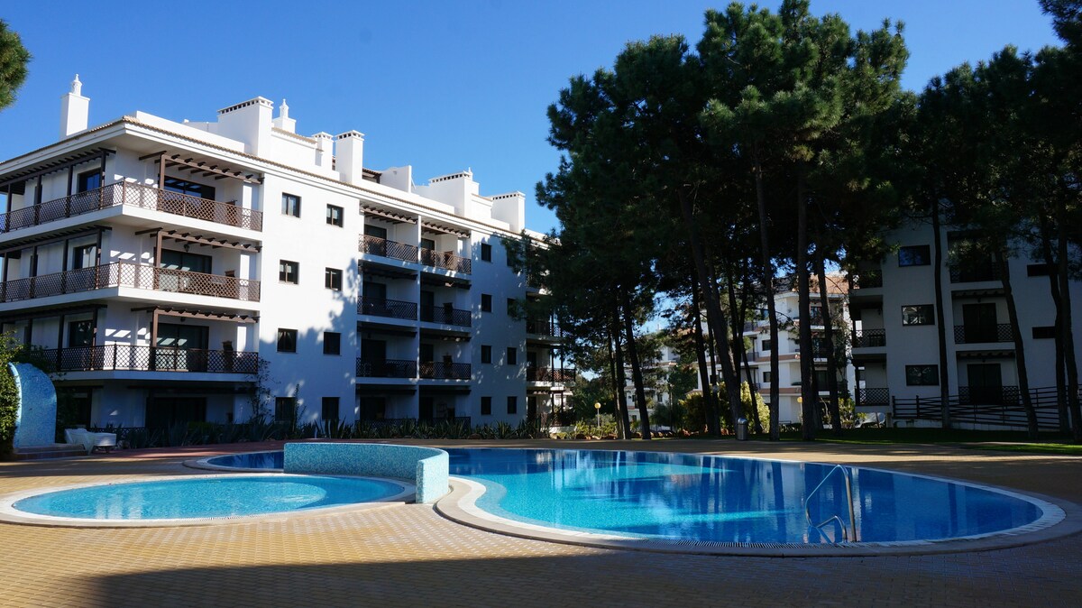 This holiday condo, is a quiet one bedroom apartment with balcony, located in the peaceful pine tree forest that surrounds Praia da Falesia (Falesia Beach). Just 10 minutes walk from one of the most beautiful beaches in Algarve, famous for its red sandstone cliffs and golden sand. The condo has a swimming pool (used from May-October and special holidays) and green area. The apartment: - One bedroom with double bed, window and closet. Bed linen are included (Extra floor mattress can be supplied for additional two people). - One living room with sofa, dinner table, satellite TV. - Full equipped kitchen (including fridge/freezer, washing machine and dishwasher) - Bathroom with bathtub - Balcony facing the swimming pool with table and chairs for your sunny meals - Swimming pool and garden open all year (swimming pool in use from May-October) The area: The apartment is located at Falesia, Algarve. Just 10 min walking to the beautiful beach of Falesia, with supermarket, restaurants and coffee shops within 5 min walk. This is a quiet place for a relaxing holiday. Although conveniently located within a 10 min drive from Albufeira and Vilamoura, with summer shops, bars and clubs, the pine tree forest is a low construction green area. The coast of Falesia beach is only occupied by Sheraton and Pine Cliffs luxury resorts. The beach is so long that it never gets overcrowded. The coastline and the surrounding countryside can be explored either on foot or by bicycle.