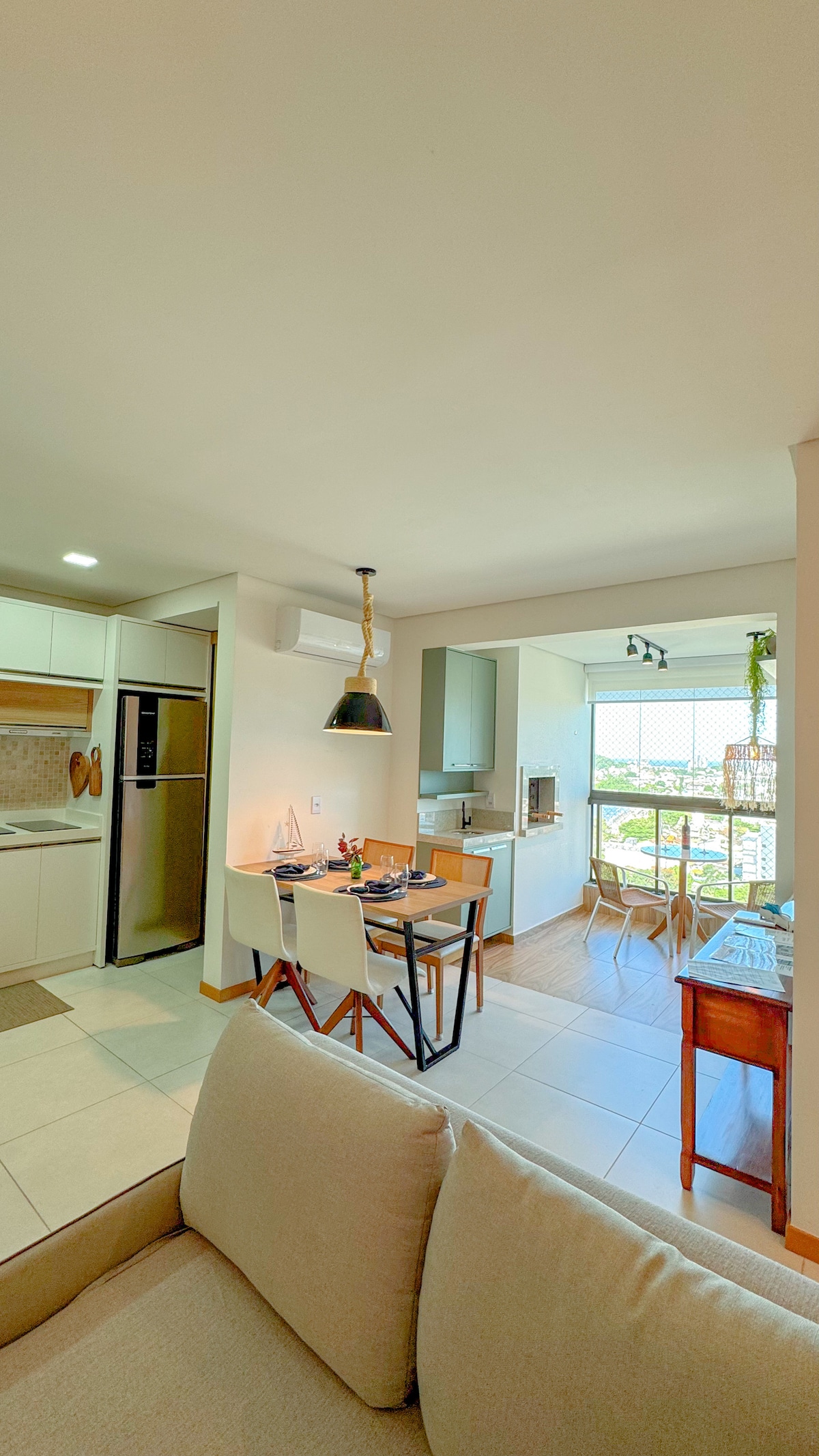 Apartamento com linda vista do mar. Rede de proteção em todas as janelas. Wifi própria. Ar condicionado em todos os ambientes. 2 quartos que acomodam até 4 adultos (18+) e 2 crianças com colchão. TV Smart 42 na sala. TV Smart 32 na suíte. Totalmente mobiliado com eletrodomésticos, utensílios de cozinha. Roupas de cama e banho. 1 vaga de garagem coberta próximo a porta. Localizado em belo condomínio, com piscina, academia, playground, sala de jogos, quadras de areia e grama, segurança 24hrs.
