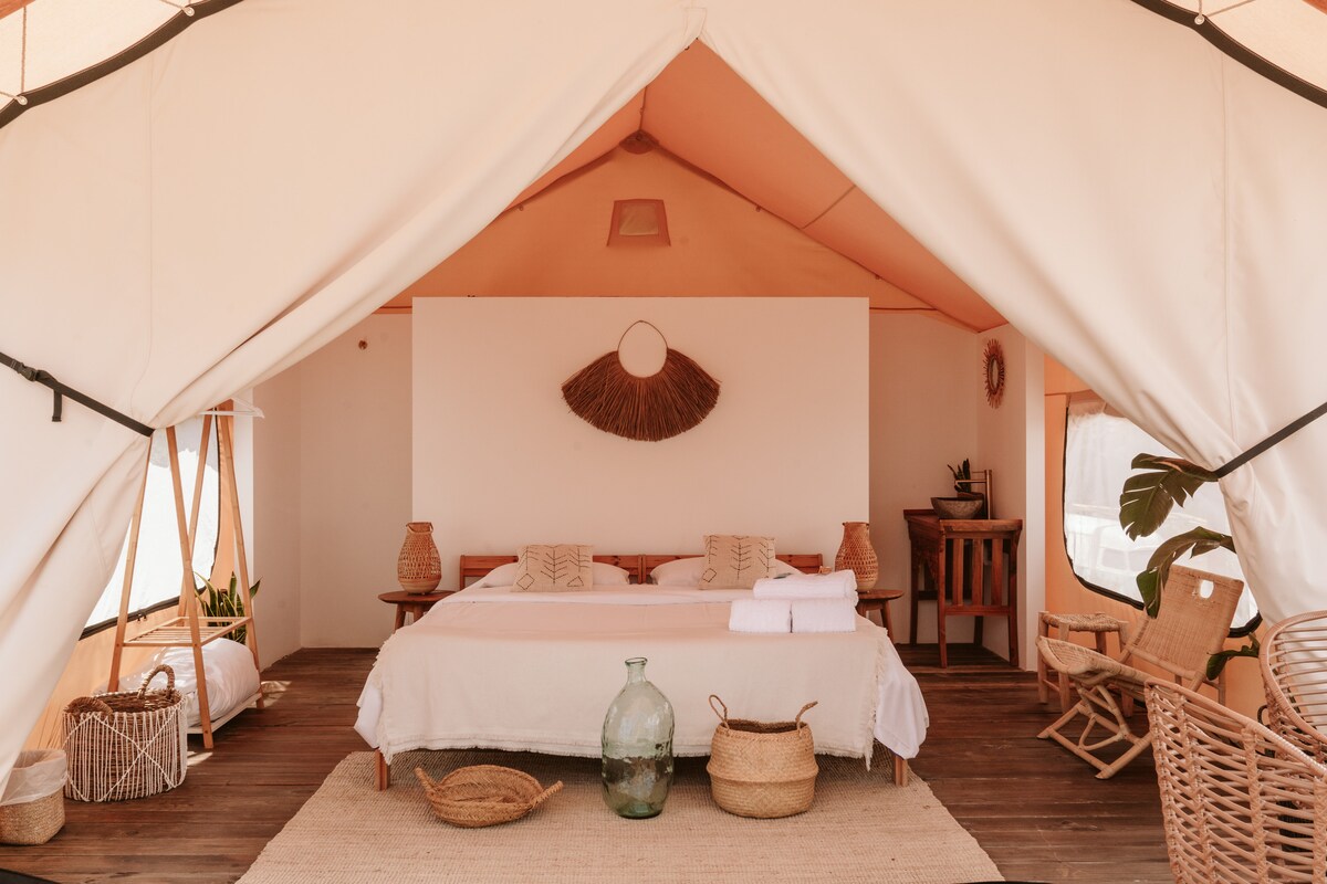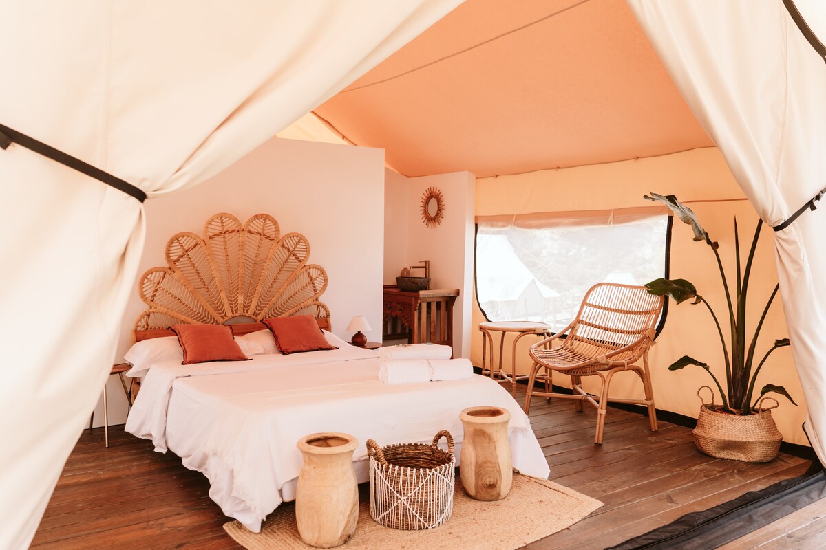 Մեր մասնավոր գլեմփինգային վրաններն իրենց հարմարավետ դեկորով կատարյալ են, եթե փնտրում եք իսկապես յուրահատուկ բացօթյա փորձառություն ։ Հագեցած լինելով երկտեղանի մահճակալով և ընդհանուր լոգասենյակով ՝ դրանք իդեալական են ընկերների և ընտանիքների համար, որոնք ցանկանում են ուսումնասիրել Միջերկրական ծովը ՝ առանց հարմարավետություն զոհաբերելու ։ Մեր ճամբարն ունի տարբեր տարածքներ ՝ լողավազան, բար, ռեստորան և ցուրտ տարածք ։ Ճամբարի բոլոր հարմարություններն ընդհանուր են, այդ թվում ՝ զուգարանները և լոգասենյակները ։