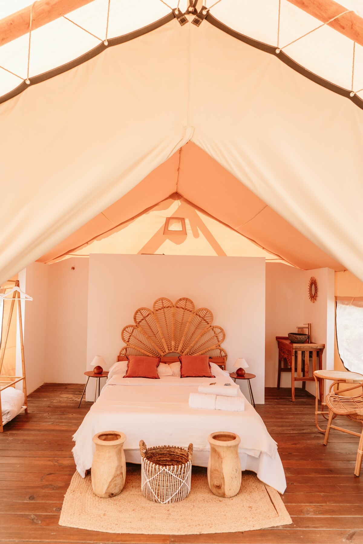 Enjoy the lovely setting of this romOur private glamping tents with their cozy decor are perfect if you’re seeking a truly unique outdoor experience. Equipped with a double bed and a shared bathroom, they’re ideal for friends and families looking to explore the Mediterranean outdoors without sacrificing comfort. Our camp has different areas: pool, bar, restaurant, and a chill area. All the facilities at the camp are shared, including toilets and bathrooms.antic spot in nature.