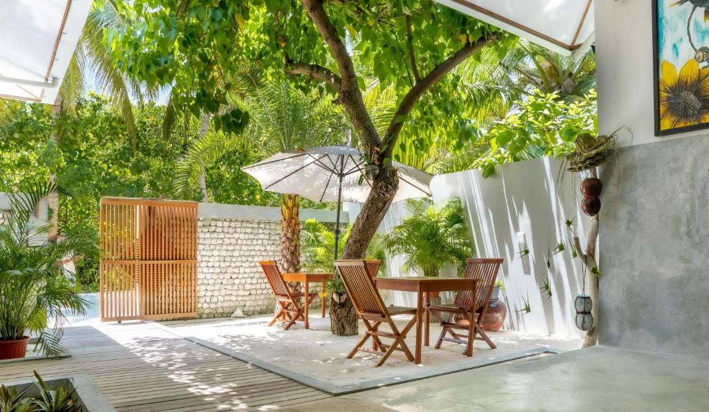 Banyan Villa is a hotel located in Dhangethi island just a minute away from the bikini beach area, perfect for a relaxing getaway in the Maldives. We offer 5 beautifully furnished hotel rooms and a restaurant on-site with a dining area where guests can relish their meals during the stay. The hotel also has an open living area outdoors where the guests can just relax and enjoy the sun. we also have a gift shop at the property in case guests want to purchase any souvenirs before checkout.