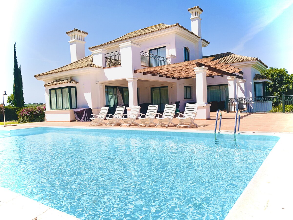 Villa espectacular y muy espaciosa de estilo andaluz con piscina con cubierta telescópica y bomba de calor. Todas las estancias son muy amplias y cuenta con extensos espacios exteriores con abundantes zonas de césped, sobre todo alrededor de la piscina. Perfecta para unas excelentes vacaciones y conocer la experiencia de habitar una cómoda y confortable hacienda andaluza. A 5 minutos andando de supermercados y restaurantes. Para eventos con más de 12 personas, consultar tarifas