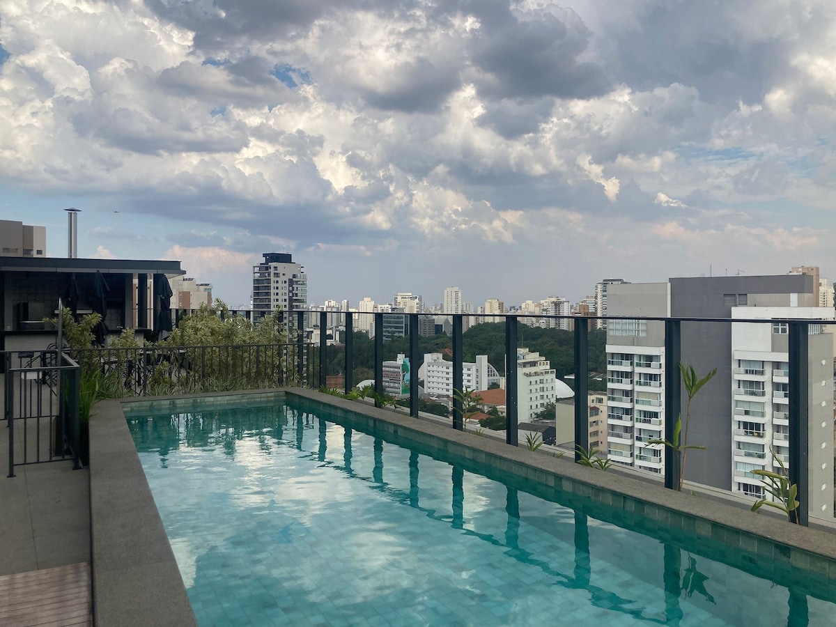 Welcome and make yourselves at home. The apartment is brand new, designed especially for you and has impeccable decor, very practical for everyday life. The view is spectacular! The apartment is on the 28th floor. We are in an excellent location in São Paulo, in the Pinheiros neighborhood, with restaurants, supermarkets and bakeries very close by. It's 40m2 (430 sqft) with 1 bedroom and 1 bathroom. Walking distance from Fradique Coutinho subway station (just 2 blocks).