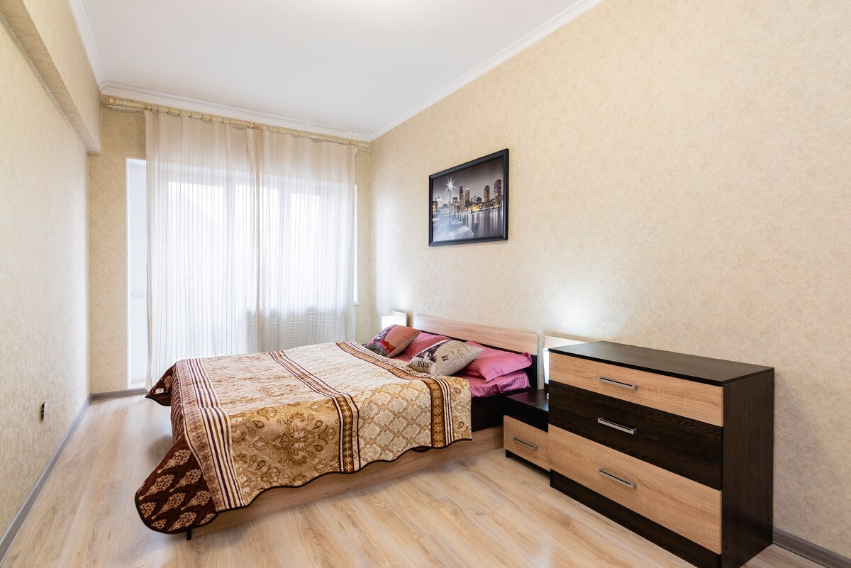 Это жилье подарит яркие воспоминания своим месторасположением - 15 минут пешком от Mega Центра. Рядом река Большая Алматинка с видом на горы, Парк Первого Президента, различные кафе, магазины, базар, фуд корт, автобусная остановка 1-2 минуты. Много интересного и нужного в шаговой доступности. Заезд и выезд гибкий без строгих ограничений, но по предварительной договорённости. 2-х спальная кровать + диван (1 место)