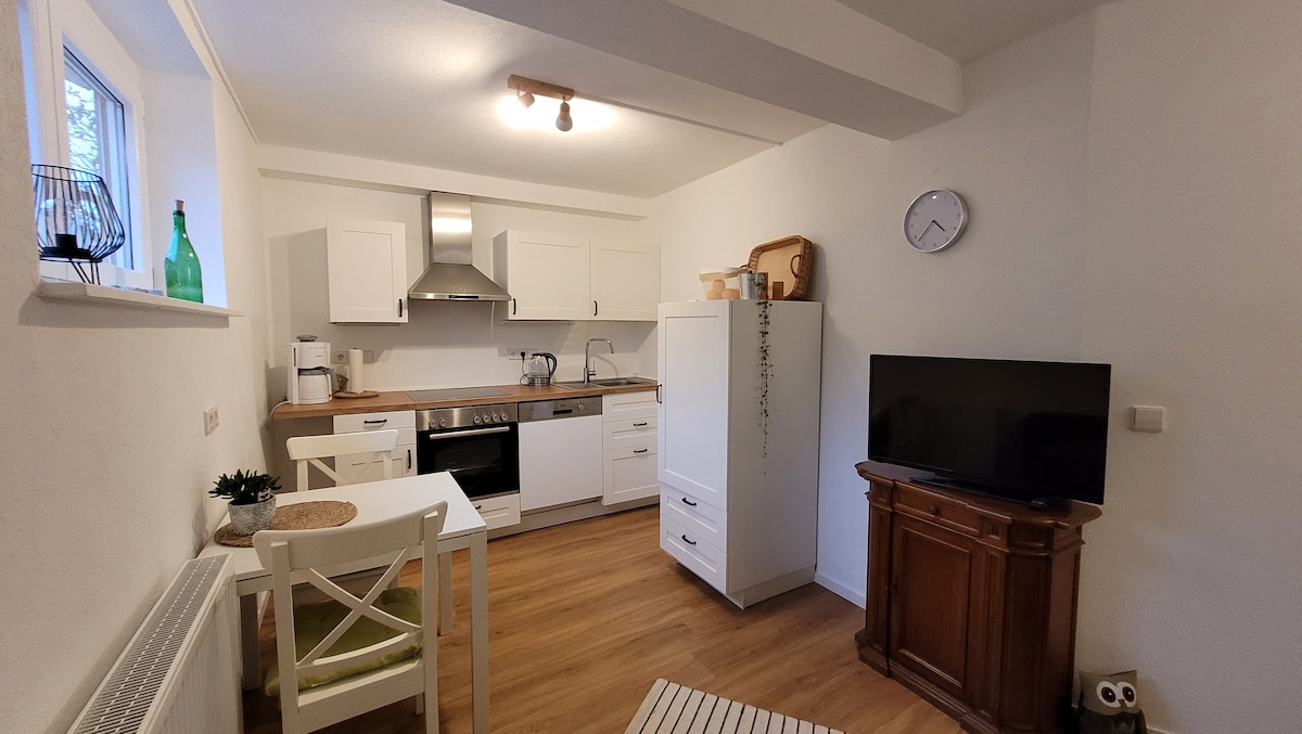 Das im Kellergeschoß gelegene Apartment verfügt über 1 Wohnbereich, der 2021 neu entstanden ist, mit Couchgarnitur, 1 Sitzecke und eine komplett ausgestattete Küchenzeile mit Geschirrspülmaschine, Wasserkocher u. Toaster. 1 SZ mit Doppelbett 180 x 200 cm und 1 Duschbad mit Sauna, die gegen Gebühr genutzt werden kann. Auch für Wanderer und Kurzurlauber geeignet, Frühstücksservice (gegen Aufpreis) , Brötchenservice, Außenbereich mit Sitzecke im Grünen