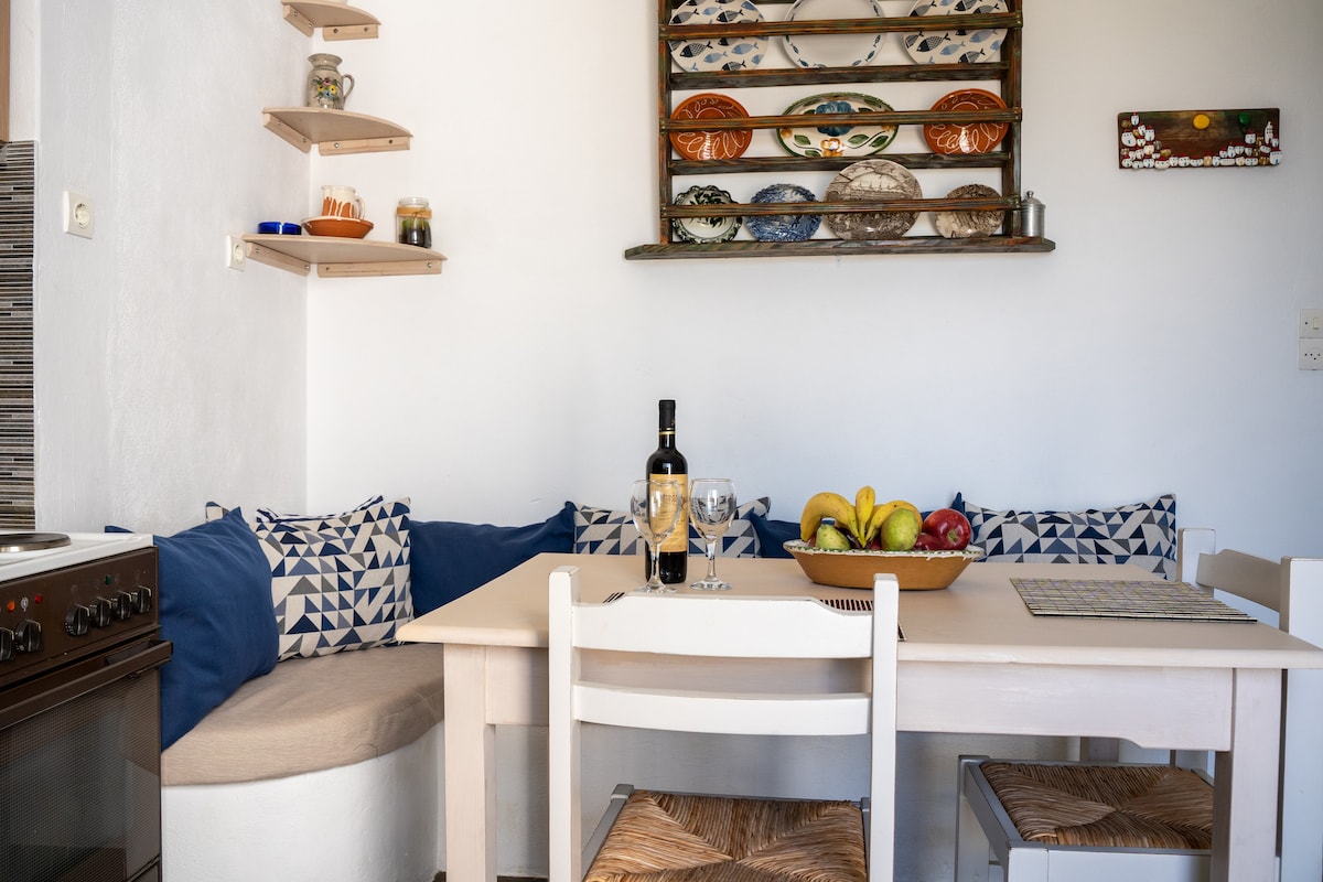 Open the sea-blue shutters and let in the cooling breeze, then whip up a snack at the urban concrete kitchen countertop at a breezy waterfront retreat. Step onto the spacious, leafy veranda for leisurely sunset drinks with unobstructed ocean views! The apartment is situated next to a sandy beach for a morning swim and a 2-minute walk from the center of Naousa and its main square. Shops, restaurants, bars, and clubs are within walking distance, yet the area is very quiet and calm!