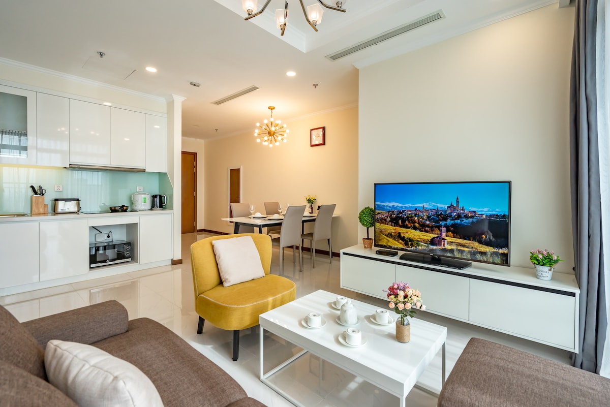 Observe and feel the city itself. The best view including 2 iconic buildings of Saigon (Bitexco Tower & Landmark 81). - Panoramic view of the city - Catch mutiples firework spots and Sunsets - Piano Included, 75 inch TV for movies and sport - Fully functional kitchen with Nam An Market bellow, perfect for groups or couples cooking nights. - Great working place by day and night - Access to swimming pool (G Floor) and gym (2nd F) - 5 mins to District 1 (City Center) - 5 mins to Thao Dien Area