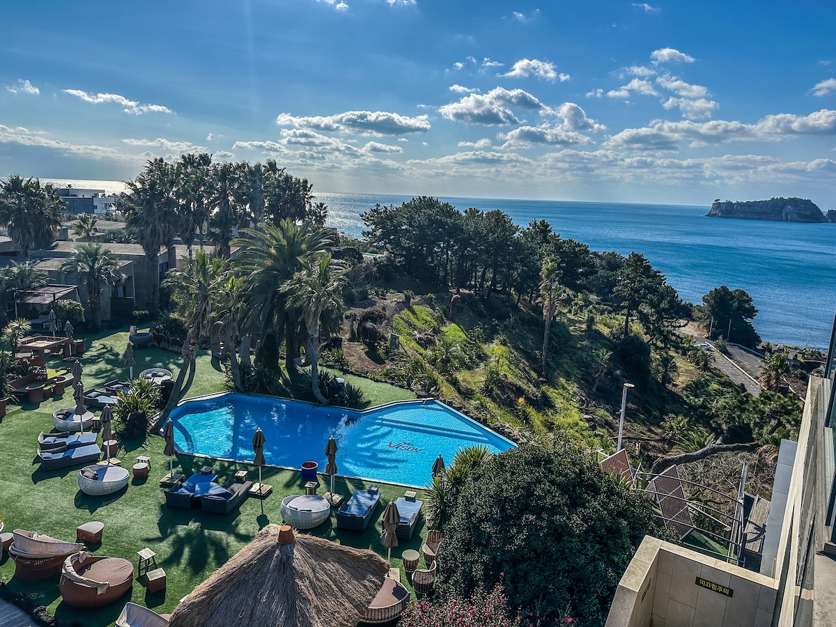 Hello. Perched on a cliff in central Seogwipo, this suite offers ocean views where islands and sea meet on one horizon. The 66㎡ private space keeps you apart from other travelers. Studio-style, yet spacious, with separate bedroom, living, and kitchen zones for an easy flow. On the terrace, soak in the spa and enjoy a private barbecue above the water. Free breakfast served with wide sea views. May to October, swim in the infinity pool facing Beomseom. The rooftop garden captures Jeju sunsets.
