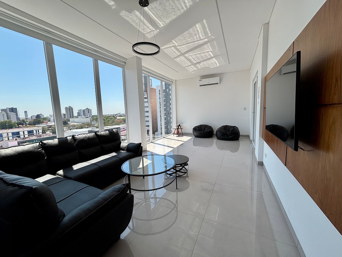 Suite de lujo en Green Tower – Santa Cruz Piso 22. Vive en el edificio más alto y exclusivo de la ciudad, en el piso 22, con vistas panorámicas a Manzana 40, el cordón ecológico y el Urubó. Disfruta de gastronomía de primer nivel en el mismo edificio, en Jardines de Asia, Caudilla, Palosanto y el impresionante Sky bar, además acceso libre a la piscina, sauna, churrasqueras. Cuenta con gimnasio Sport Motion. Un departamento nuevo! amoblado con piezas de alta gama, incluyendo sofá cama grande.