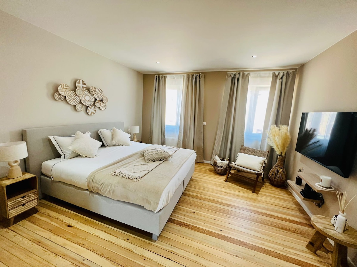 Այրվող քաղաքի սրտում ՝ Gare des Guillemins - ին մոտ, մենք առաջարկում ենք 100 մ2 մակերեսով այս շքեղ լոֆթը այնպիսի ոճով, որը միավորում է նրբագեղությունը հմայքի հետ: Դասական և հանգստացնող միջավայրում ՝ ռոմանտիկ գիշեր կամ հանգստյան օրեր ՝ բալնեոթերապիայի լոգասենյակով, էկզոտիկ բացօթյա տարածքով, ընդարձակ լոգասենյակ ՝ երկու անձրևի գլխով, լողացող մահճակալ ՝ իտալական դիզայնով ՝ երկու հոգու համար հանգստանալու համար ։ Ռոմանտիկ կամ անհատականացված ձևավորման հնարավորություն ՝ ըստ պահանջի ։