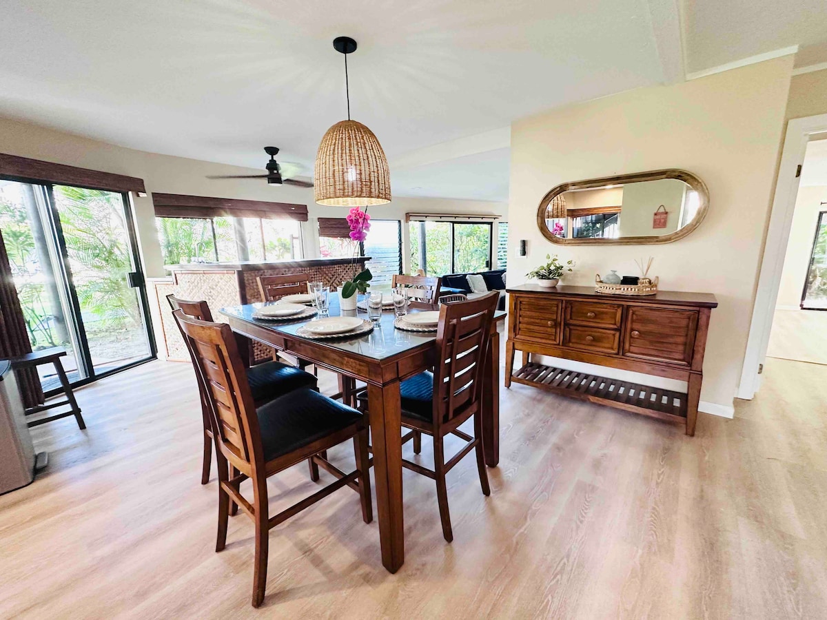 🌺 Բարի գալուստ ձեր խաղաղ Կաուայի օազիսը, որը լի է հարմարություններով։ ☀️ Լուսավոր տունը ժամանակակից հարմարավետությունն է միավորում Կաուայիի բնական գեղեցկության հետ։ 🌿 Մտածված ձևավորում՝ ուրախ արվեստով և բարձրակարգ կահույքով։ ✅ ՆՈՐ նորաձև վերափոխված դիզայն ✅ ՆՈՐ օդորակիչ յուրաքանչյուր սենյակում ✅ 8 րոպե մինչև Հանալեյ ✅ Երկտեղանի մահճակալ ✅ Հարմարավետ բազմոց մահճակալ (1–2 հոգու համար) ✅ Լիովին կահավորված խոհանոց ✅ Լվացքասենյակ և չորանոց բնակարանում ✅ Արագ Wi - Fi + աշխատանքային տարածք ✅ Լողափի + Սնորկելի հանդերձանք ✅ Սմարթ հեռուստացույցներ ✅ Մուտք դեպի լողավազան, ջակուզի և խորոված ✅ Անվճար, ամրագրված կայանատեղի