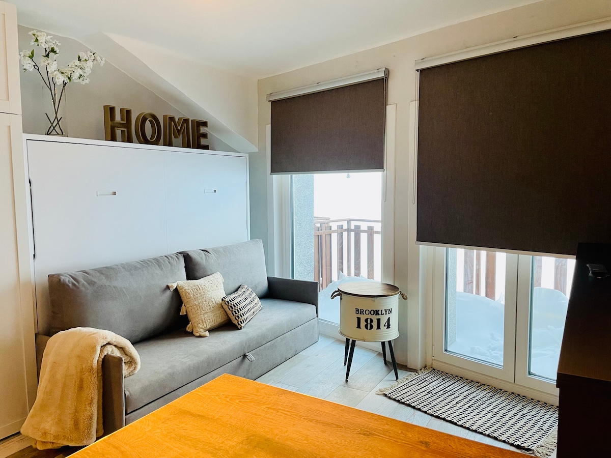 Enjoy a stylish experience in this central accommodation located just about 80m from the ski slopes, with direct access to all necessary services (bars, restaurants, supermarkets, pharmacies, sports shops) just out of the portal. The space has all the comfort and everything you need to spend unforgettable days. It faces east and has a balcony where you can relax with a book, eat, have a drink while contemplating the spectacular mountains.