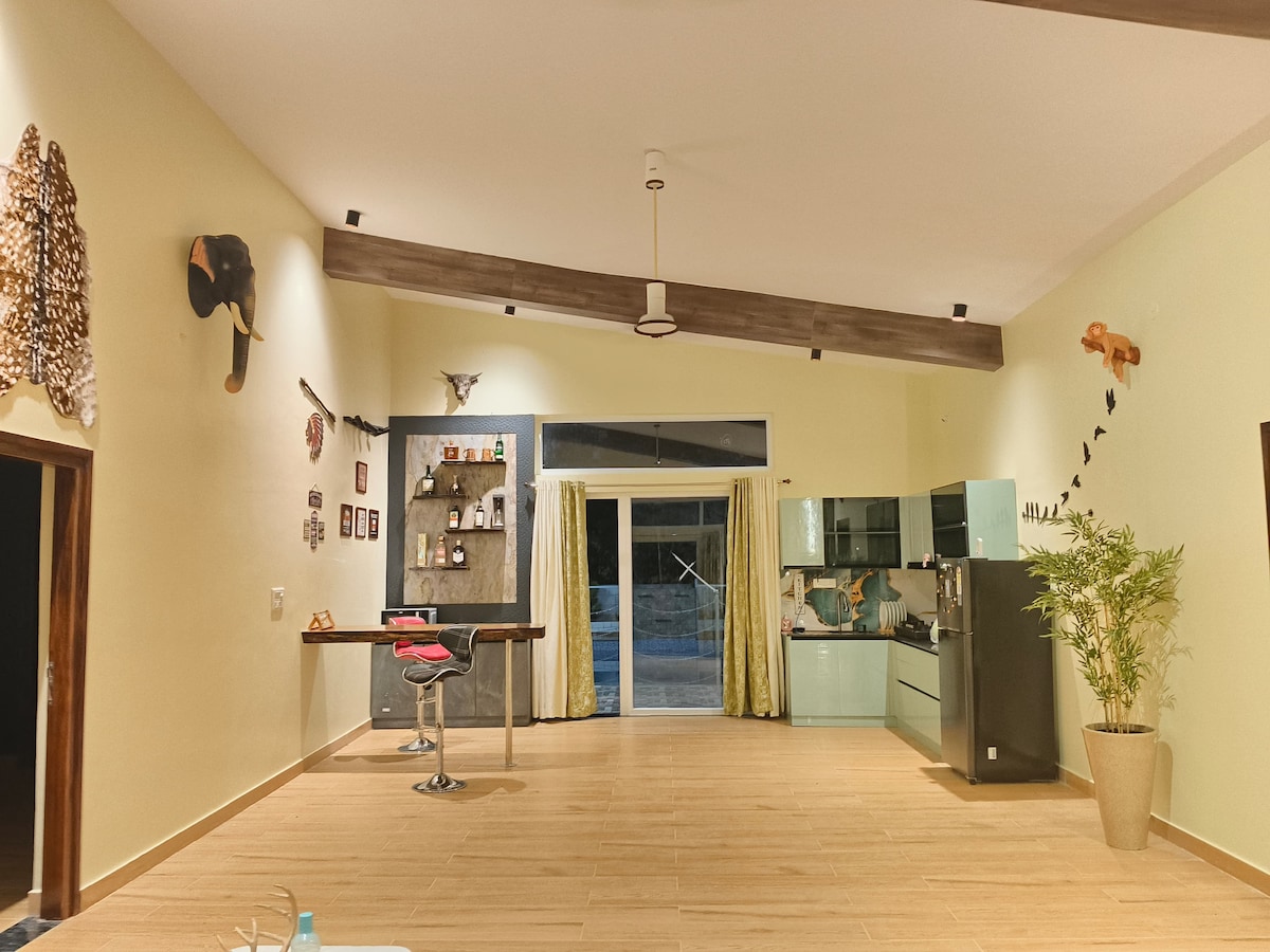 This luxurious 3-bedroom farmstay offers a perfect escape nestled amidst lush green mango orchards. Designed in a classic US-style cottage, it features spacious and comfortable interiors. A perfect getaway with a range of fun amenities, including a foosball table, volleyball court, badminton, and board games. It's an ideal retreat for spending quality time with friends, family, or loved ones in a relaxing and entertaining environment.