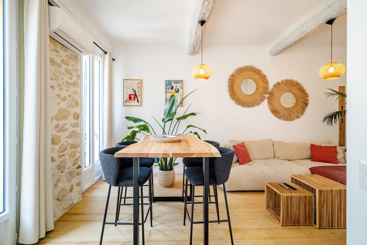 Գեղեցիկ սեփականություն ՝ հիմնական միջավայրում ։ Հենց ռեպարտների և ծովափի մոտ ՝ այն հազվադեպ է պարծենում Անտիբեսի հին քաղաքում ՝ ՏԵՌԱՍՈՒՄ ։ Այս 1 BR - ը հարմար է մինչև 4 հոգու համար. 160 սմ լայնությամբ մահճակալ ննջասենյակում և 160 սմ թախտ հիմնական սենյակում: Լիովին կահավորված խոհանոց (ներառյալ ամանալվաց մեքենա, Nespresso մեքենա և այլն), մեծ ցնցուղի լոգասենյակ, օդորակիչ/ջեռուցիչներ, Wi - Fi, Bluetooth բարձրախոս, լվացքի չորանոց ։ Հենց ձեր դռան մոտ ՝ պրովանսական շուկա, խանութներ, լողափ, բարեր, ռեստորաններ...