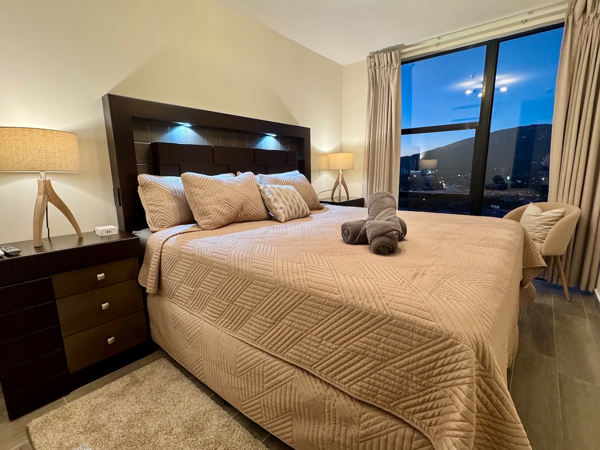 Welcome to Your Home Away from Home Enjoy this wonderful apartment located in a new and modern building, in a safe and central area. You will enjoy stunning views of the mountain range. Apartment Features: 2 Cozy Bedrooms: Each bedroom is equipped with a comfortable Queen bed and air conditioning to ensure your comfort. 2 Full Bathrooms with Hot Water Fully Equipped Kitchen Private Terrace High-Speed Internet Workspace Access to pool and gym