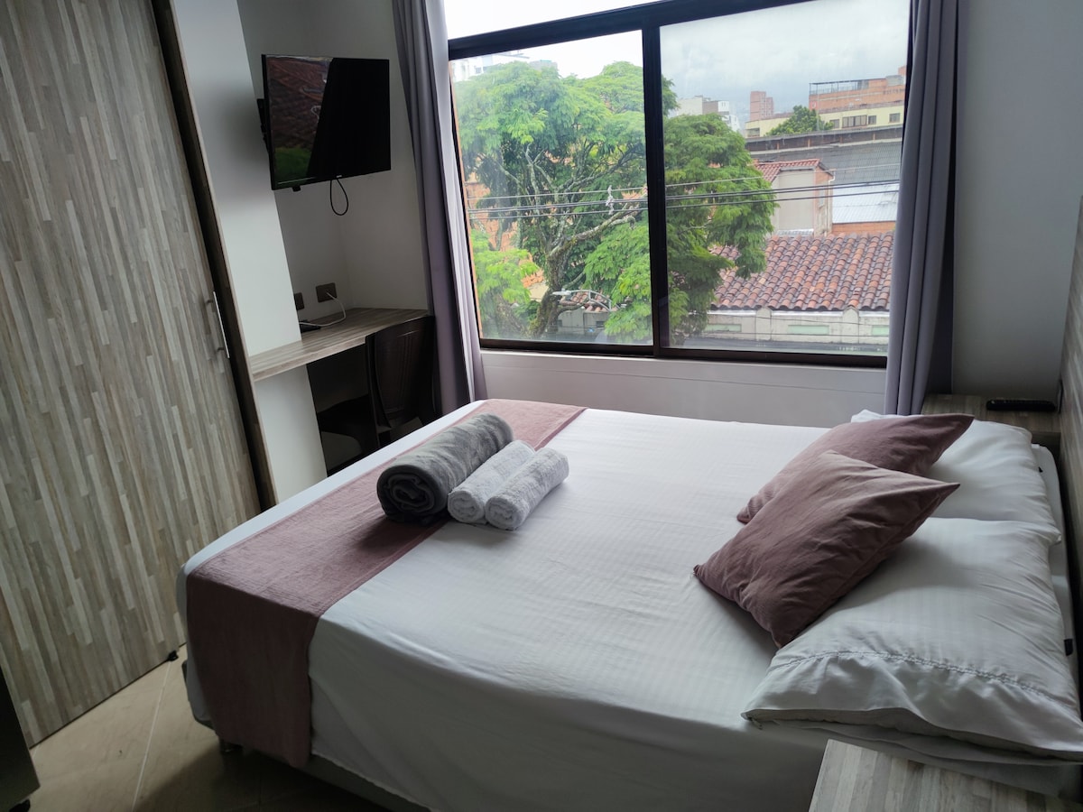 Լիովին կահավորված 28 քմ մակերեսով, օդորակիչով և խոհանոցիկով: Գտնվում է Մեդելինի լավագույն տարածքներից մեկում ՝ շատ հանգիստ թաղամասում, որը գտնվում է բոլոր տեսարժան վայրերի հարևանությամբ ։ Սյուիտից բացվում են քաղաքի և լեռների տպավորիչ տեսարաններ ։ Դուք կարող եք օգտվել աշխատավայրից, մարզասրահից և տպավորիչ սուրճից, որն առաջարկում է տարբեր տեսակի խմիչքներ ՝ հիմնված կոլումբիական լավագույն սուրճի վրա, կարող եք վայելել ձեր խմիչքը շենքի 2 - րդ հարկում գտնվող կտուրում: