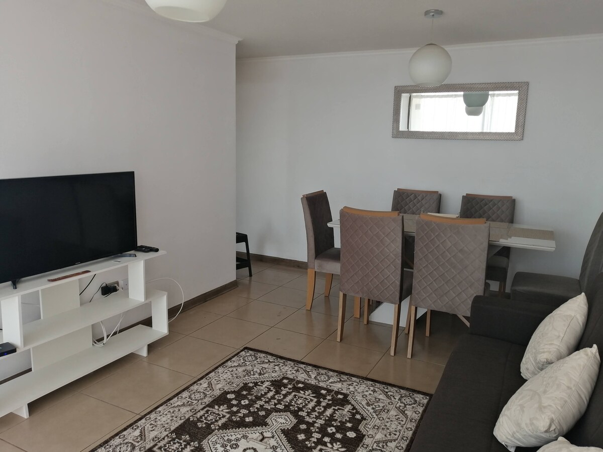 Բարի գալուստ Անտոֆագաստայում գտնվող ձեր ժամանակավոր տուն ։ Այս բնակարանը գտնվում է քաղաքի հյուսիսային հատվածում ՝ օդանավակայանից 10 րոպե հեռավորության վրա, շենքի չորրորդ հարկում ՝ վերելակով և հյուրասենյակից բացվող ծովի տեսարանով ։ Այն ունի ՝ - Հարմարավետ ննջասենյակ ՝ երկտեղանի մահճակալով ։ - Փոքր ննջասենյակ ՝ 1,5 քառակուսի մահճակալով ։ - Հյուրասենյակ բազմոցով և կաբելային հեռուստատեսությամբ ։ - Wi - Fi ինտերնետ ։ - Խոհանոց ՝ հագեցած այն ամենով, ինչ անհրաժեշտ է խոհարարության համար ։ - Լվացքի մեքենան հասանելի է ։ - Ներառված է մասնավոր կայանատեղի ։