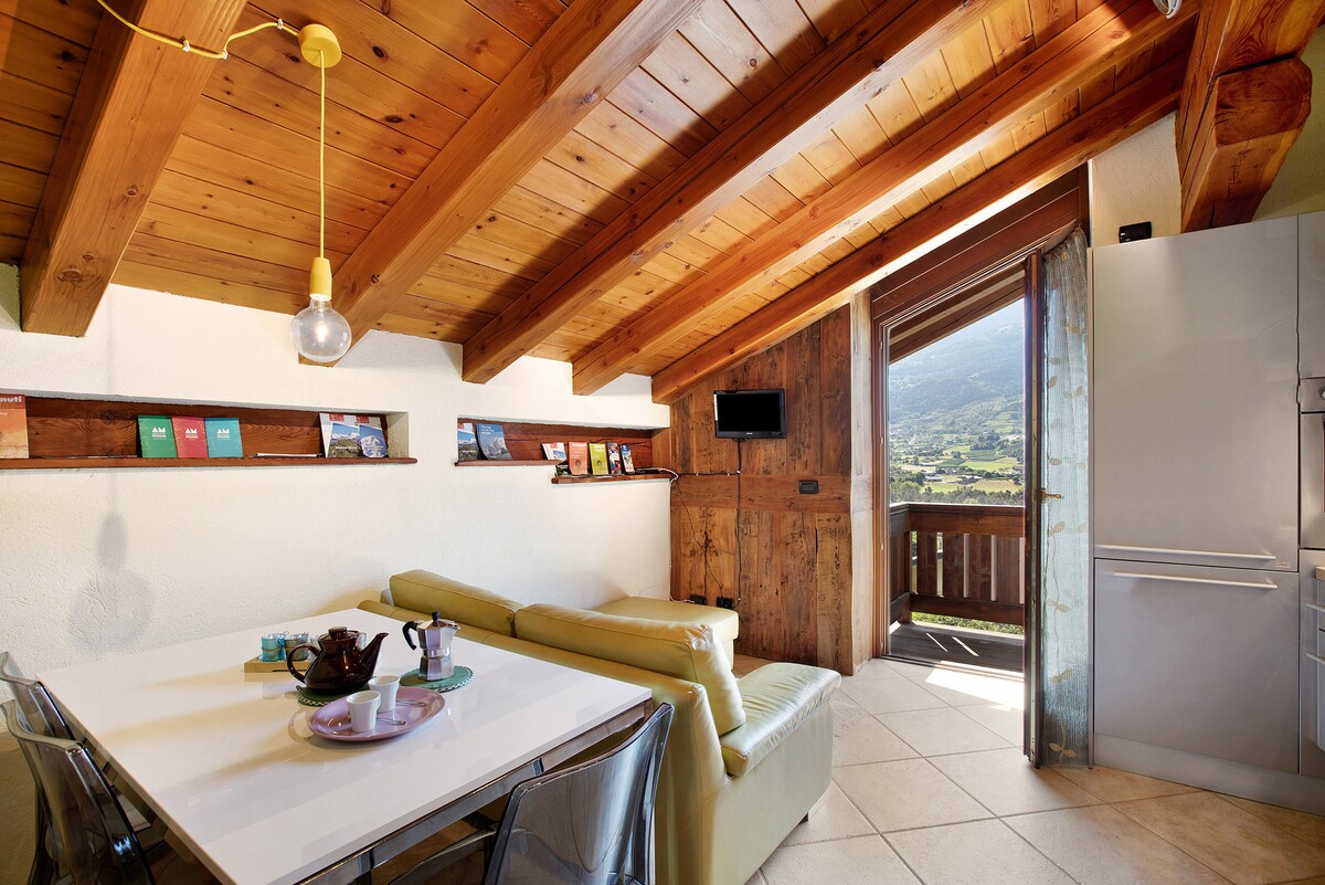 Jona բնակարանը գտնվում է գյուղի կենտրոնում ՝ առաջին հարկում, և հարմարավետ մեկ ննջասենյակով բնակարան է ՝ հիանալի ֆիլանդյան ջակուզիով և սաունայով, որը իդեալական է այն զույգերի համար, որոնք ցանկանում են փայփայել Աոստայի հիանալի հովիտ այցելելուց հետո: Հյուրասենյակ ՝ բազմոցով և խոհանոցով, երկտեղանի ննջասենյակ ՝ երկտեղանի ջակուզիով և ֆանտաստիկ սաունա ՝ ցնցուղով հագեցած լոգասենյակից բացի ։ Բոլոր բնակարանները նախատեսված են առավելագույն հարմարավետության և հանգստի համար ։