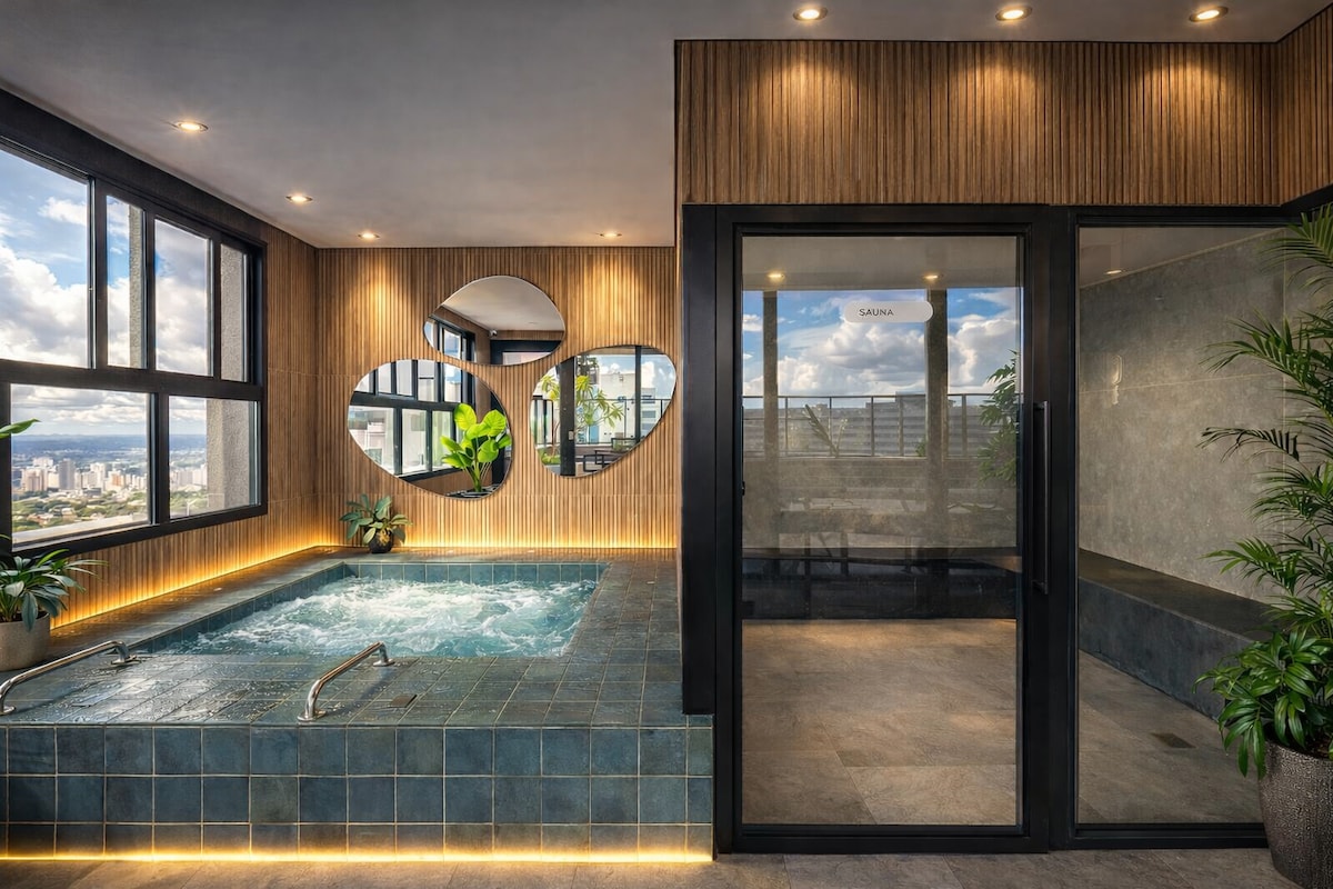 Stay in the best part of the Marista district, with a pool inside the apartment. Premium location, just steps from the best bars, restaurants, boutiques, cafes and Ricardo Paranhos Street. On the 34th floor, enjoy the pool with an incredible view. This high-end apartment combines modern design with a sophisticated urban vibe, featuring exclusive art by the artist Selon. It offers comfort in every detail, with quality furniture, elegant finishes and a large, cozy sofa.
