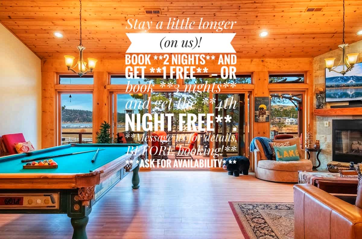 Այս տունն ունի այն ամենը, ինչ անհրաժեշտ է 1, 2 կամ 3 ընտանիքների համար ՝ հավաքվելու կամ հանգստանալու համար ։ Ginormous բնակելի տարածք 20 ֆուտ երկարությամբ առաստաղներով և 4 սկայպով, լճի տեսարանով, լողավազանի սեղանով, 2 մեծ սմարթ հեռուստացույցով և մեծ կրակարանով: Վերին տախտակամածն ունի մեծ սեղան, խորոված և հարմարավետ նստատեղ ։ 2 կապված լոֆթ ՝ փարոսբոլով, արկադայով և տոննա խաղերով ։ Ավելացրեք գնդակի փոսը, որպեսզի այս տունը դառնա մանկական երազանք ։ Արագ քշել դեպի Sky Park կամ Snow Valley. Մեծ Արջը ընդամենը 45 րոպե հեռավորության վրա է: