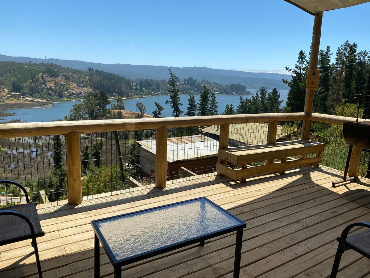 Cabaña cumbres del lago Vichuquén con hermosa vista. A 5 minutos de Playa Paula (boulevard del lago, artesanías y más) y a 20 min de playas Llico, Lipimavida, Duao e Iloca🌊. Relájate en la piscina compartida para dos cabañas🏊♂️