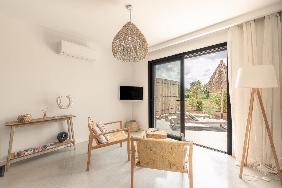 Բարի գալուստ մեր առանձին հյուրերի քոթեջ, հարմարավետ և մտերմիկ հանգստի անկյուն, որը կատարյալ է 2 հյուրի համար։ Մեր սեփականության տարածքում գտնվող, բայց լիովին մասնավոր այս քոթեջը ջերմ, մինիմալիստական և էկզոտիկ դեկորով է, որը ոգեշնչված է մեր ճանապարհորդություններով։ Խաղողի այգիներով և գյուղական տեսարաններով շրջապատված, Բորդոյից մինչև Սենտ-Էմիլյոն ճանապարհի կեսին գտնվող այս վայրն իդեալական է հանգստանալու և ուժերը վերականգնելու համար։ Տարածքը դասակարգված է որպես 4 աստղանի։