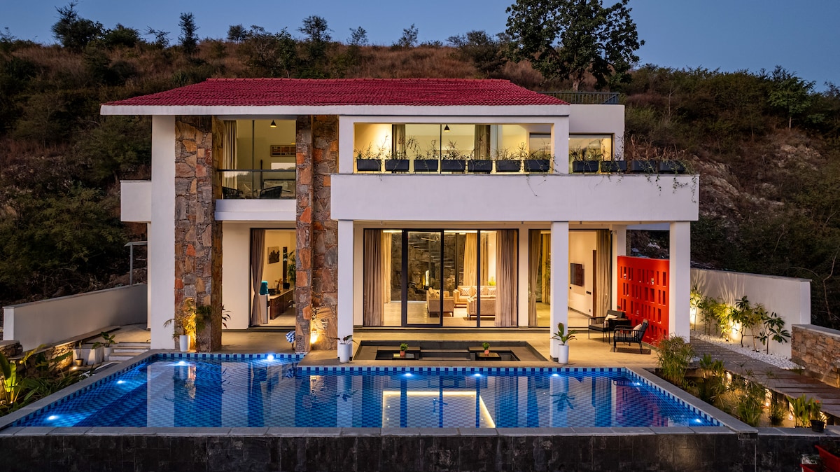• <b> Շքեղ Aravalli վիլլա </b>․ 15 000 քառ․ ֆուտ, 3 սենյակ, խոհանոց և առանձին լոգասենյակ, տնային կենդանիների հետ մնալու հնարավորություն, մասնավոր լողավազան և ջակուզի։ • <b> Անվճար</b>. ողջույնի զամբյուղ և 1 ժամ խարույկ (դեկտեմբեր/հունվար)։ • <b> Գուրմանների խոհանոց</b>. լիովին կահավորված՝ վառարանով և խոհարարով (պահանջի դեպքում)։ Հնարավոր է առաքում Zomato/Swiggy-ի միջոցով։ • <b> Ժամանց</b>. 4000 քառակուսի ֆուտ խոտածածկ, բիլիարդի սեղան, ներսի և դրսի խաղեր, 75 դյույմ Smart TV։ • <b> Լրիվ սպասարկում</b>. շուրջօրյա տնային աշխատող, խոհարար, կայանատեղ 5 ավտոմեքենայի համար։
