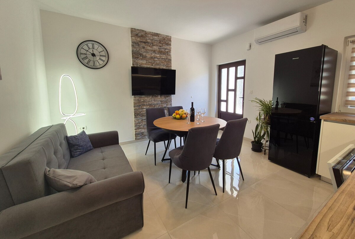 Our cozy 2BD apartment can accommodate 4 people very comfortably. It also has a balcony with a seaview and an open BarBQ.The beach is 15m away and has a small restaurant with snacks and meals.Enjoy your vacation in a quiet&sunny village only 3km from Trogir!