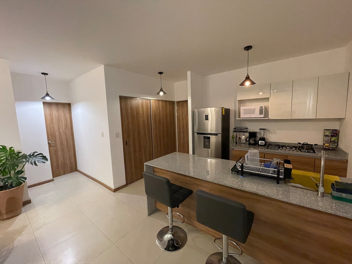 Շքեղ և գեղեցիկ բնակարան ՝ արտ - դեկո դիզայնով և կահույքով, հանգստացեք և վայելեք տեսարանը, քանի որ այն գտնվում է 9 - րդ հարկում, ունի այնպիսի հարմարություններ, ինչպիսիք են գեղատեսիլ լողավազանը, մարզասրահը, համայնապատկերային տանիքը, սոցիալական սենյակը, խորովածի գրիլները, անվտանգությունը և վերելակները: Բնակարանն ունի մեկ սենյակ ՝ երկտեղանի մահճակալով, մեկ զուգարան, լվացքասենյակ, ամբողջական խոհանոց, սառնարան ՝ սառցե մեքենայով և սառը ջրի դիսպենսերով ։ Մենք տրամադրում ենք 2 սրբիչ ցնցուղի համար և 2 սրբիչ լողավազանի համար ։ Մենք նաև առաջարկում ենք շրջագայություններ դեպի քաղաք և կախարդական քաղաքներ ։
