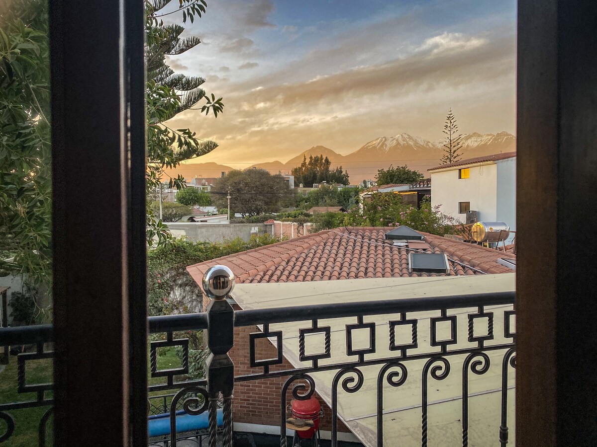 Encantadora casa muy bien iluminada y con todas las facilidades. Distribución primer piso: amplia cocina, Sala con TV 42" netflix, comedor, patio con jardín. Segundo piso 1 habitación con baño privado, dos camas y escritorio (puede ser convertida en cama matrimonial). Tercer piso: una habitación con cama matrimonial baño privado, escritorio y una terraza perfecta para disfrutar del sol arequipeño (con hamaca, mecedora, mesa y bancas). Contamos con wifi y agua caliente.