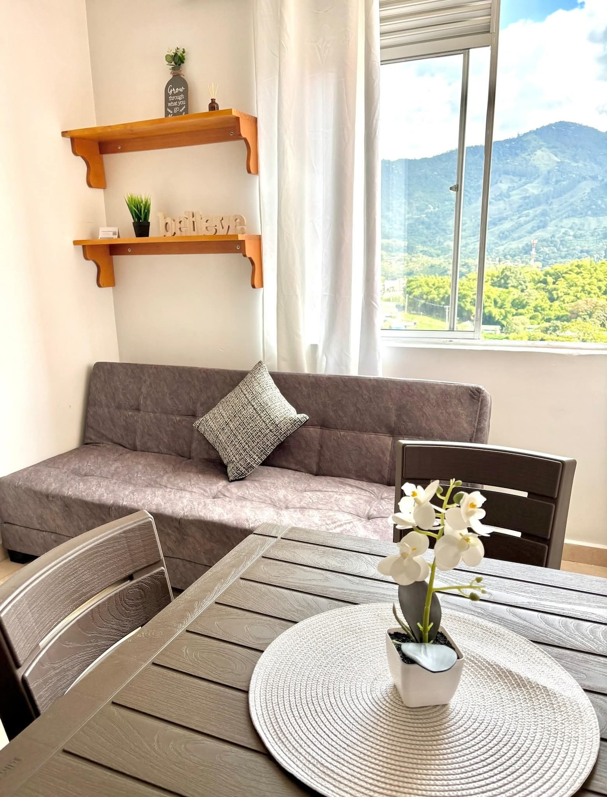El alojamiento cuenta con una hermosa habitación Disfruta de un espacio moderno y acogedor, con una hermosa vista a las montañas y a la Cordillera Central. Está equipado con todas las comodidades necesarias para una estadía confortable: TV HD, sala, barra americana, cocina totalmente equipada, zona de ropas, baño con agua caliente, wifi y sky lounge. Siempre estaremos atentos a cualquier necesidad que tengas durante tu estadía, para que tu experiencia sea lo más agradable posible.