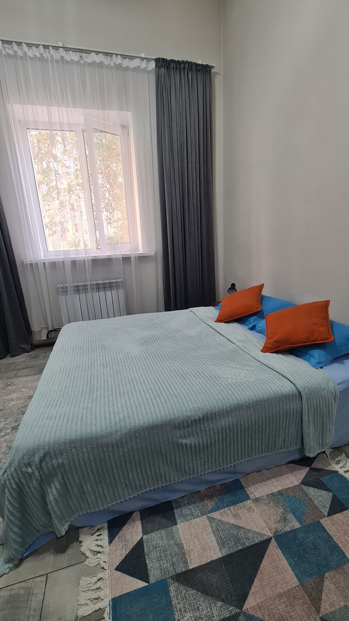 Modern and comfortable apartment in best central area Golden Square. Ideal 4 1st time visitors: safe, walkable neighborhood with the city’s top attractions nearby. Walk to Arbat street, Panfilov Park, Green Bazaar, cafés and restaurants no taxis needed. Fully equipped Nespresso, AC, TV, washing machine, kitchen with full cookware and iron. Fast Wi-Fi with 2 providers. Smart lock with easy 24/7 self check-in. Towels, slippers and toothbrushes included. Perfect for tourists and business travelers.
