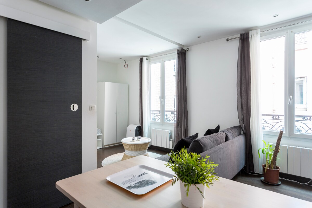 ⭐ Highly rated for its calm atmosphere and fast access to Paris. Stay in a bright designer loft just 2 minutes from Mairie de Clichy metro (Line 13), reaching central Paris in 10 minutes. Perfect for a romantic getaway or business trip, the apartment offers comfortable bedding, a cozy living area, a workspace with high-speed Wi-Fi, secure residence access, and easy self check-in for a smooth, stress-free stay.