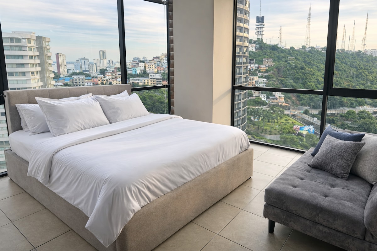 Descubre el confort elevado en el corazón de Guayaquil. Este exclusivo departamento de 2BR mas 3BA te ofrece una experiencia única con vista panorámica. El dormitorio principal cuenta con una cama de 2.5 con cama extraíble adicional; el 2do dormitorio ofrece 2 camas amplias de 1.5 mismo estilo. Disfruta de espacios completamente nuevo, minibar, 3 Smart TVs 65” y 75” ideales para maratones de películas además de agua caliente, lavadora/secadora - A/C Todo lo que necesitas, en un solo lugar.