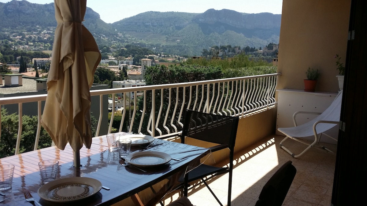 Appartement lumineux de 70m2 avec vue imprenable sur le port de cassis, le château, le cap canaille ( plus haute falaise d'Europe). Vous pourrez vous déplacer à pieds depuis l'appartement pour vous rendre en plein coeur de Cassis où il y a tous les commerces, restaurants,bars et à 150 mètres des 2 plages. Rénové en Mars 2018 , tout confort , grand salon avec coin repas ,chambre principal avec un grand dressing lit de (160X200 ),cuisine aménagée et équipé, salle de bain avec douche à l'italienne.